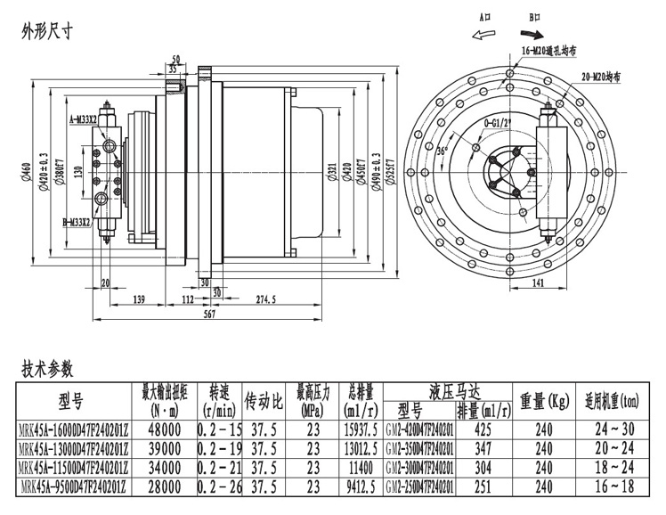 MRK45系列以上的行走減速機(jī)輸出扭矩在40000扭米以上,最大到十萬(wàn)扭米,可采用柱塞馬達(dá)或者斜軸馬達(dá)驅(qū)動(dòng)。一般用在大型履帶底盤或者輪式行走用。